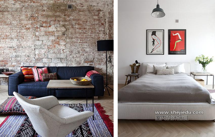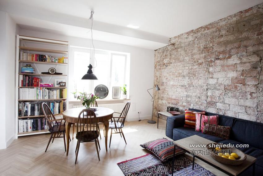 01、客厅空间最醒目的就是沙发背景墙了,大小不等的红砖拼接出带有乡村气息的空间,当然也可以根据空间的需要,加上一些软装饰来配合空间的风格和自己的喜好,百搭的红砖墙一定会让你满意;最喜欢的要数带有民族图案的地毯和靠垫,为空间注入一丝波西米亚的热情,墙角没有浪费和实木餐桌一起涉及的就是这个大书架,不仅可以在这里用餐还可以阅读休闲,真是多功能的空间组合。