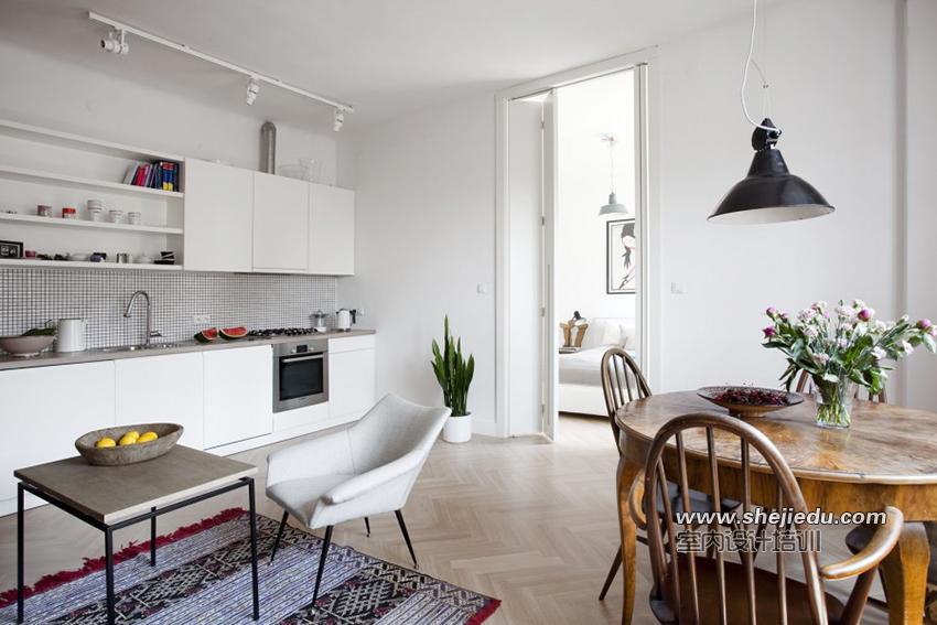 02、空间不大但是设计师经过些许变动让这个空间更加的合理,空间的利用度更高,这里厨房和客厅、餐厅共用一个空间,开放式的厨房选用白色的整体橱柜,在吊柜旁边又打造一些开放式的收纳架,这样收纳装饰两不误;实木地板和造型古典的餐桌椅具有强烈的北欧风。