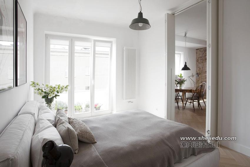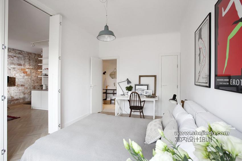 03、客厅旁边的空间是卧室空间,有一扇门连接起来,这就是非常标准的北欧风了,当然也可以根据需要进行一些软装饰,为空间带来一些现代气息。