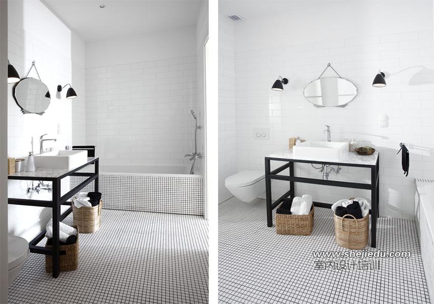 07、看看精致的卫生间吧,在浴盆和地面上设计师选用马赛克瓷砖装饰地面,墙面上黑色的壁灯和椭圆形的镜面组合成卡通的图案,两个收纳篮可以分别收纳不同物品。