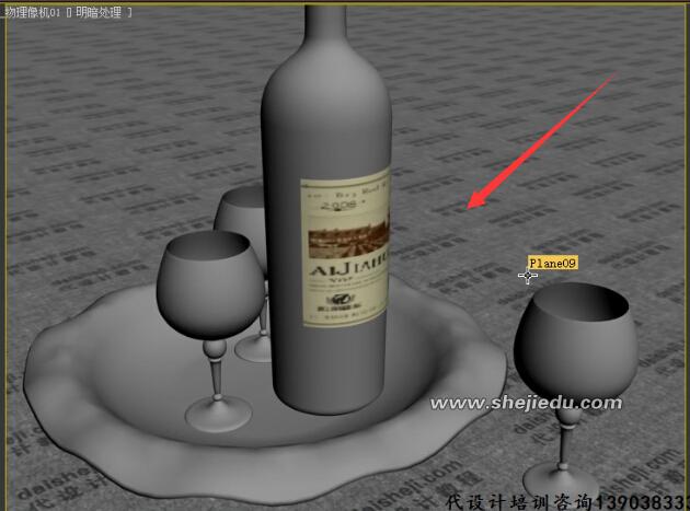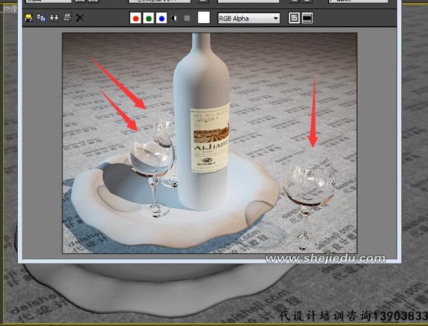 06、可以看到箭头所示的酒杯材质已经渲染出来了。