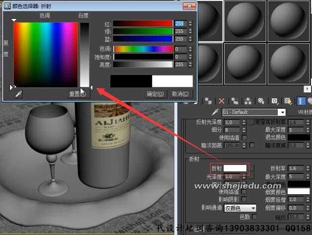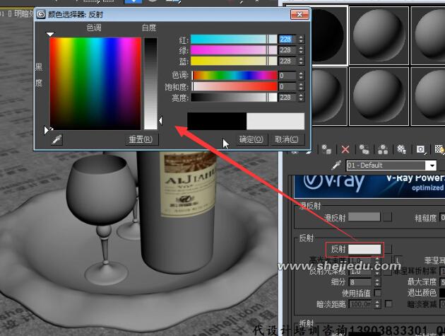 02、我们先给场景文件中的玻璃酒杯赋上透明的玻璃材质,由于不需要给颜色,所以漫反射不需要调节,主要还是我们的折射是全白的,所以漫反射是什么颜色我们无需注意,现在将反射的程度调节成如图所示。