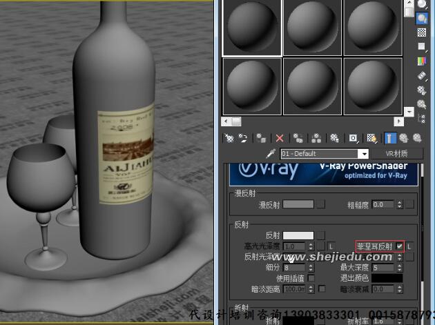 03、我们一定要勾选菲尼尔,因为玻璃的反射很清晰,所以我们一般不用调整反射光泽度。