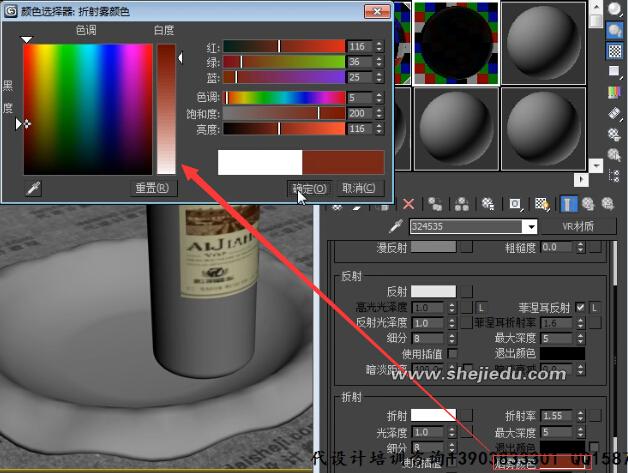 07、我们接着调节酒瓶的材质,最快捷的方法就是复制之前酒杯材质球,只需要调整烟雾颜色如图就可以了。
