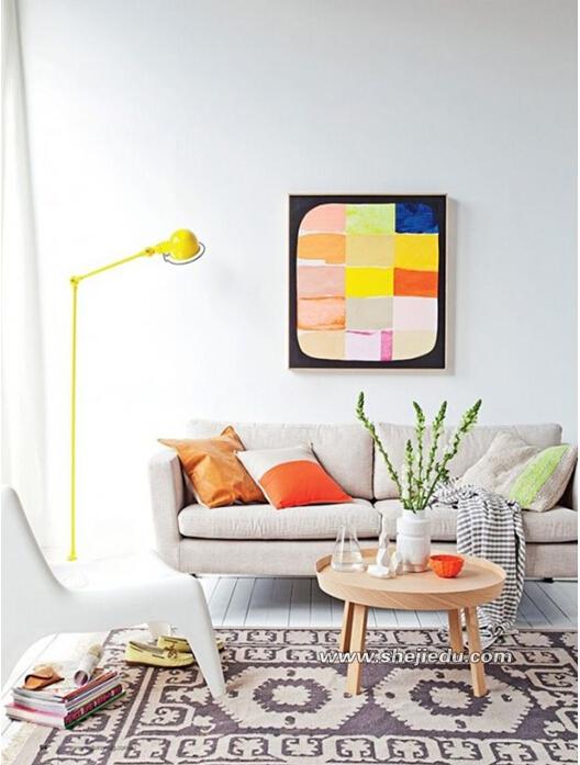 08、稍有保留的人可以这样装饰你的空间,米白色的家具搭配白色的墙面会显得乏味单一,但是这个色块装饰画让空间注入一抹动人的颜色,让中规中矩的家看起来轻松时尚。