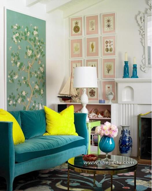 01、这个小小的局部因为菱形的枚红色装饰的墙面而大不同,艳丽的黄色沙发和蓝色的边桌,让这里轻松活泼很有朝气。
