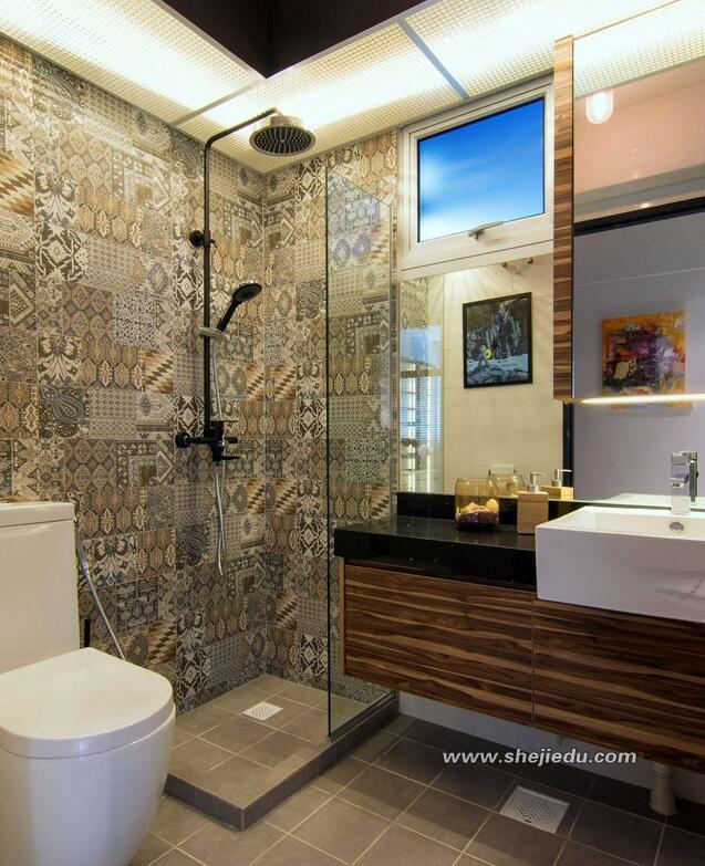 07、卫生间同样也是时尚迷人,同时不失温暖,土色的地面和墙面上带有摩洛哥风格的瓷砖是不是很温馨,玻璃简单的隔离了淋浴房,这样空间设计的紧凑大方,也和整体空间风格非常的一致。