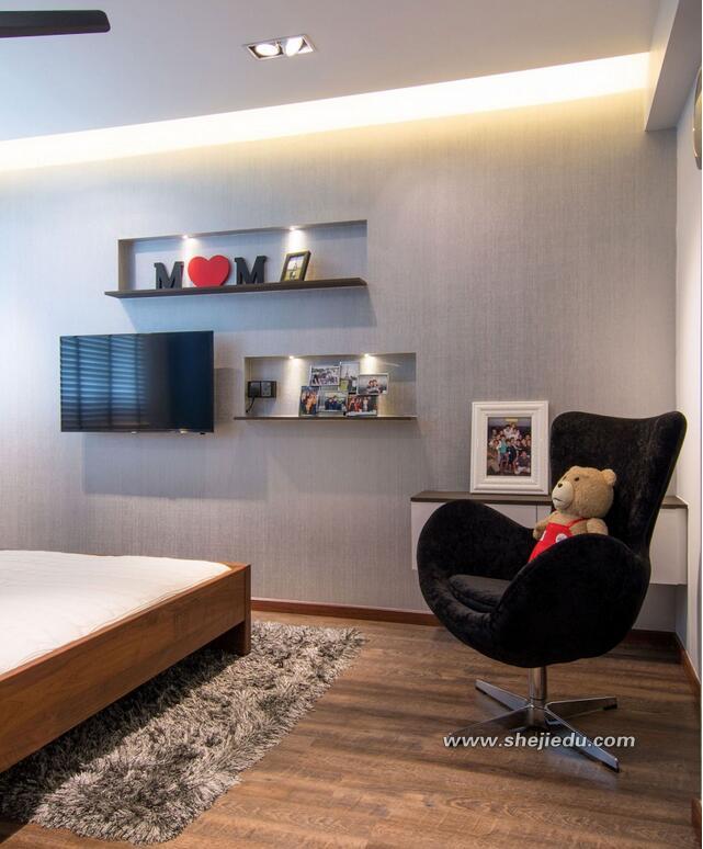 06、卧室空间浅灰色的墙面和实木材质的地面,空间高贵舒适;墙面上的收纳架可以展示相片和装饰品,灯光也起到很好的装饰效果,这里尤其是吊顶的灯带。