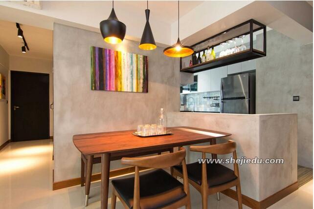 04、开放式的厨房可以更加轻松的用餐和布置收纳物品,这里实木材质的餐桌椅非常的时尚新颖;不同造型的吊灯和混泥土墙面上的彩虹色装饰画一起,既精致又粗犷。