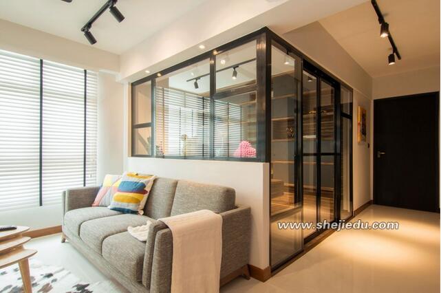 沙发后面设计一个玻璃空间,可以推拉的玻璃门和黑色的框架让这个空间通透明亮,空间没有华丽的吊灯,简约时尚的射灯满足一切需要。