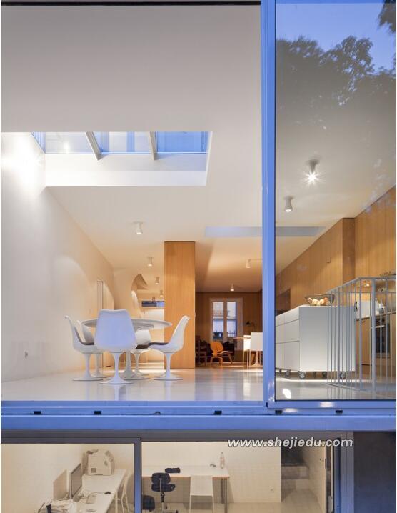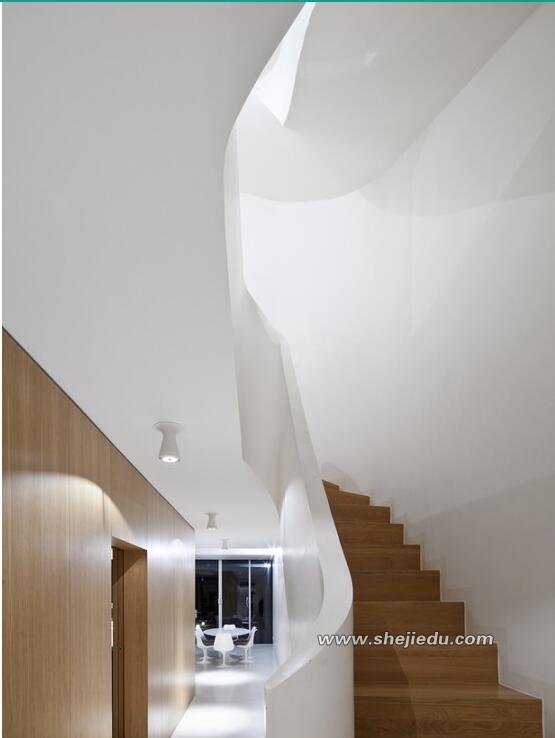 04、透过玻璃墙可以看到上下两层的空间结构,下层空间是一个白色为主的工作室。这也是设计师在设计中的与众不同。