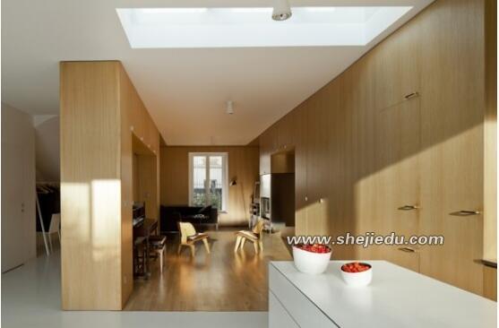 03、橱柜延伸的部分是室内会客区,实木材质的地板和白色的瓷砖地面让空间的区域分隔清晰;其中实木材质的墙将空间分隔成为两部分。