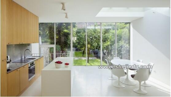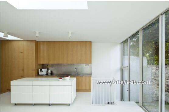 01、白色和实木色搭配简单大方,设计的亮点在屋顶部的天窗和整面的玻璃墙,室外郁郁葱葱的风景延伸到室内,在这里烹饪和用餐都是一种享受。