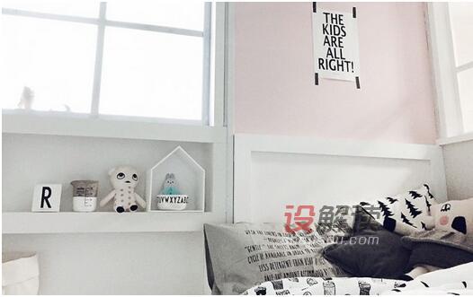 07、这间卧室总算有点色彩,床头背景墙装饰了浅粉色,临窗的下面设计了收纳格,这样放置一些卡通的玩具增加空间的童趣。