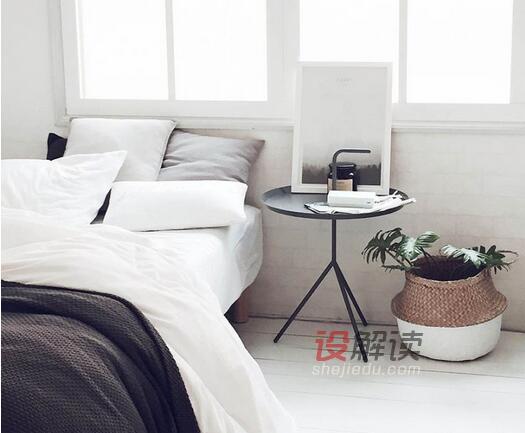 05、空间不是很大所以没有选择宽敞的大床,临窗的下面单人床上白色和灰色的布艺床品和周围的风格色调统一协调,墙面上黑色的床头灯固定在墙面上,金属茶几可以放置收纳一些零碎的物品。