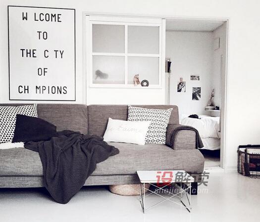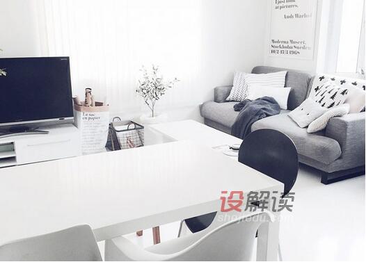 01、空间决定布局,开放式的设计是再合适不过了,白色的墙面搭配深灰色的长沙发,黑白灰极简风格不管是在时装或是空间里都是不会过时的保证。屋内地板皆使用瓷砖,而非北欧风格中惯用之木地板,改藉由地毯、抱枕等织品软件增添踩踏暖度,轻松造就优雅纯净又带点可爱的无压风格。
