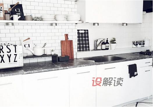 04、厨房的墙面上设计了长方形的白色瓷砖铺设,带来丰富的层次感,灰色的大理石操作台搭配白色的整体橱柜,整体风格非常的统一,空间设计的细节到位,在吊柜下面安装了两盏射灯,便于洗刷整理食物。