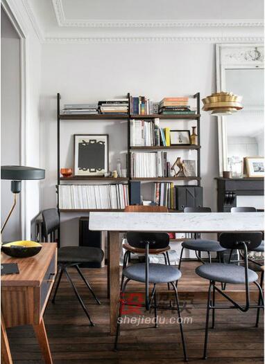 03、正确的比例,纹理和颜色组合比复杂形式或过度的时尚效果更重要。实木的地板铁管打造的开放式收纳架和带有花纹造型边框的镜子,空间没有互相矛盾,更多了一些层次感。