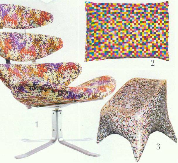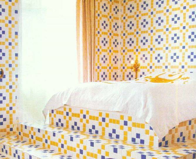 每隔几年,马赛克风潮就会回归,它多变而不凌乱,即使居室中布满了马赛克也不会显得繁琐,我们偏爱用它来混合色彩或表达秩序的美感,像抽象画一般永不过时。 马赛克适合的人群:喜爱抽象派的人群会格外偏爱马赛克风格,他们喜爱用色彩的混合与拼接来表达个性,就像意识流一般,摒弃了具体的形象,只保留随合所欲的情绪。 细节分析:马赛克早已不再是浴室的专用材质,用它来装饰客厅乃至卧室都已成为风尚。这间卧室的地板和墙壁统统由黄、蓝、白三色的马赛克组成,它们拼接而成的抽象图案蔓延开来,上演着秩序的美感。没有床架、床垫被三级台阶高高架起,坐在上面可以俯瞰整个房间,像一个祭坛一般,多了几分神圣的感觉。金黄色的灯具和牛头装饰很好地中和了马赛克材质的冰冷感。与米色的窗帘搭配在一起,给卧室增添暖意。案例欣赏1、由布艺制造出的马赛克质感,斑斓的色彩混合在一起却不显得繁杂,呈现给我们缤纷的美。2、看上去仿佛由细小的马赛克拼成,其实只是布艺花纹给我们的视觉错觉。既有抽象美感,又能带给我们柔软舒适的坐感,是不是独具匠心呢?3、流线的造型搭配上马赛克材质,让这把座椅看上去仿佛是来自外太空的生物一般另类,不用担心舒适性,看看它圆润的线条就知道一定会契合我们的身体曲线。回到首页,查看更多室内设计培训学习资料。